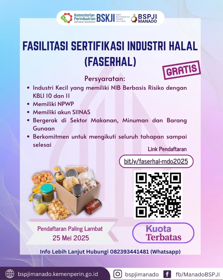 Anda pelaku usaha makanan, minuman, atau produk konsumsi lainnya? LPH BSPJI Manado membuka kesempatan untuk ikut Seleksi Fasilitasi Sertifikasi Industri Halal Gratis bagi pelaku usaha di sektor pangan…